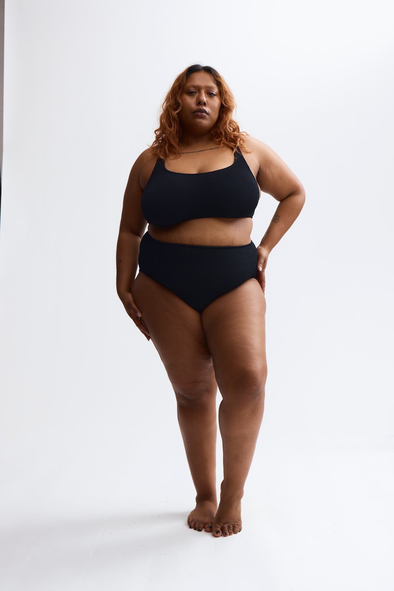 High Waist bikini bottoms offer a little more hip and belly coverage than Standard and can be worn above or below the belly button.