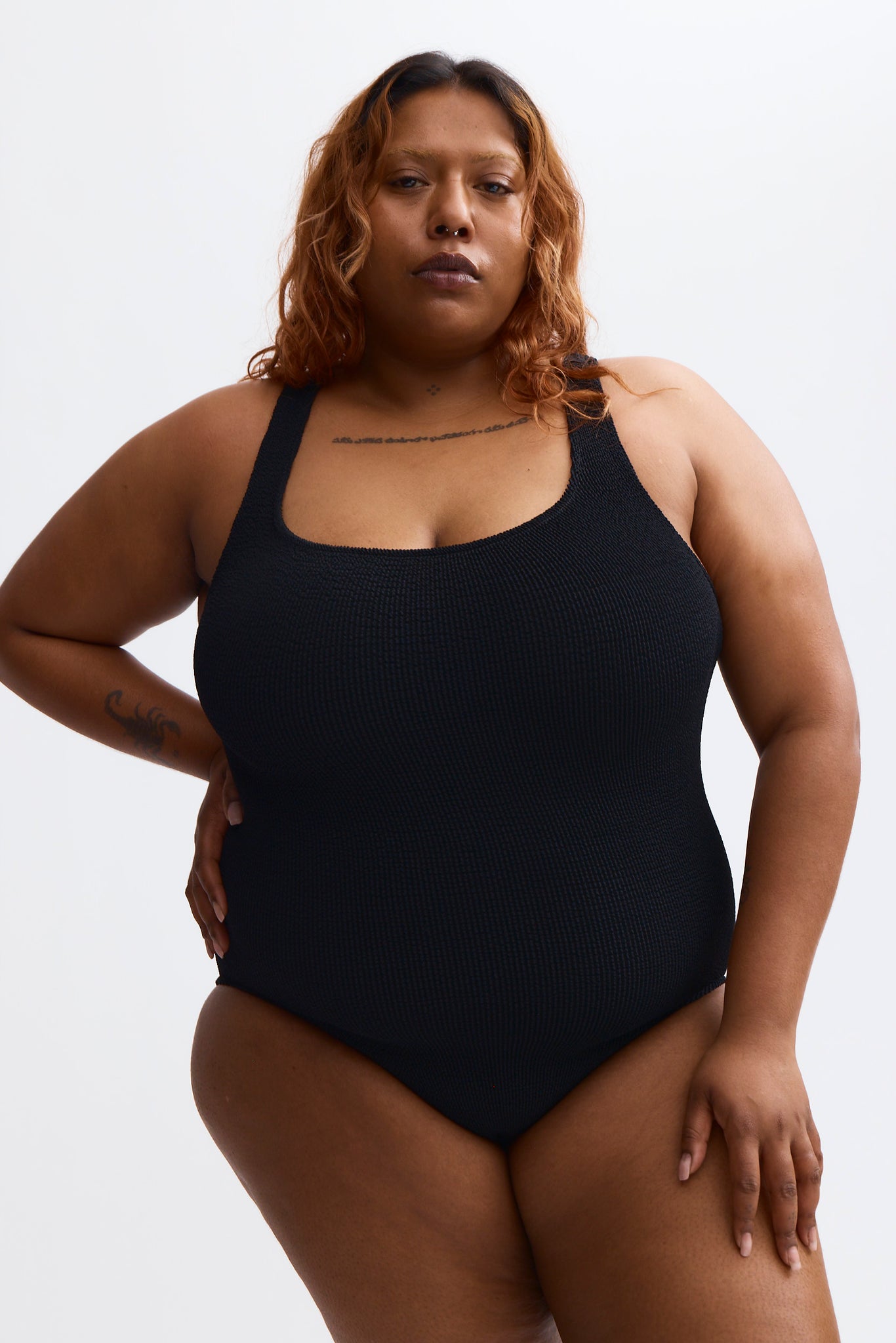 On the bottom, the One-Piece offers a similar cut to our Standard and High Waist bikini bottoms.