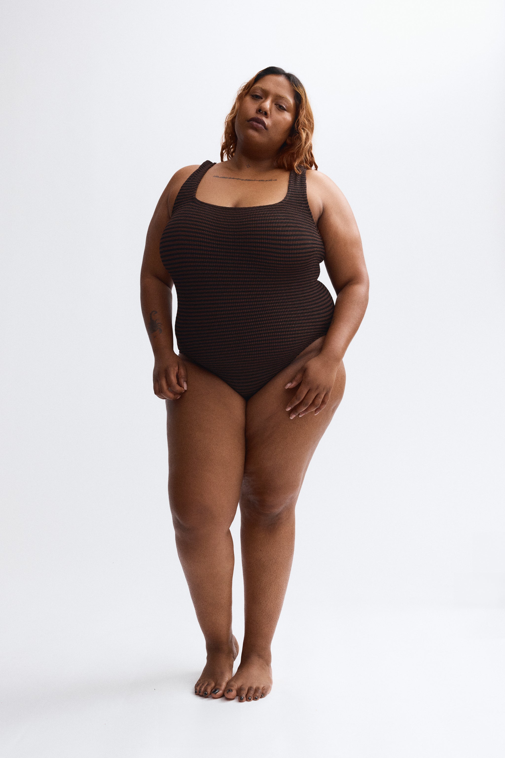 On the bottom, the One-Piece offers a similar cut to our Standard and High Waist bikini bottoms.
