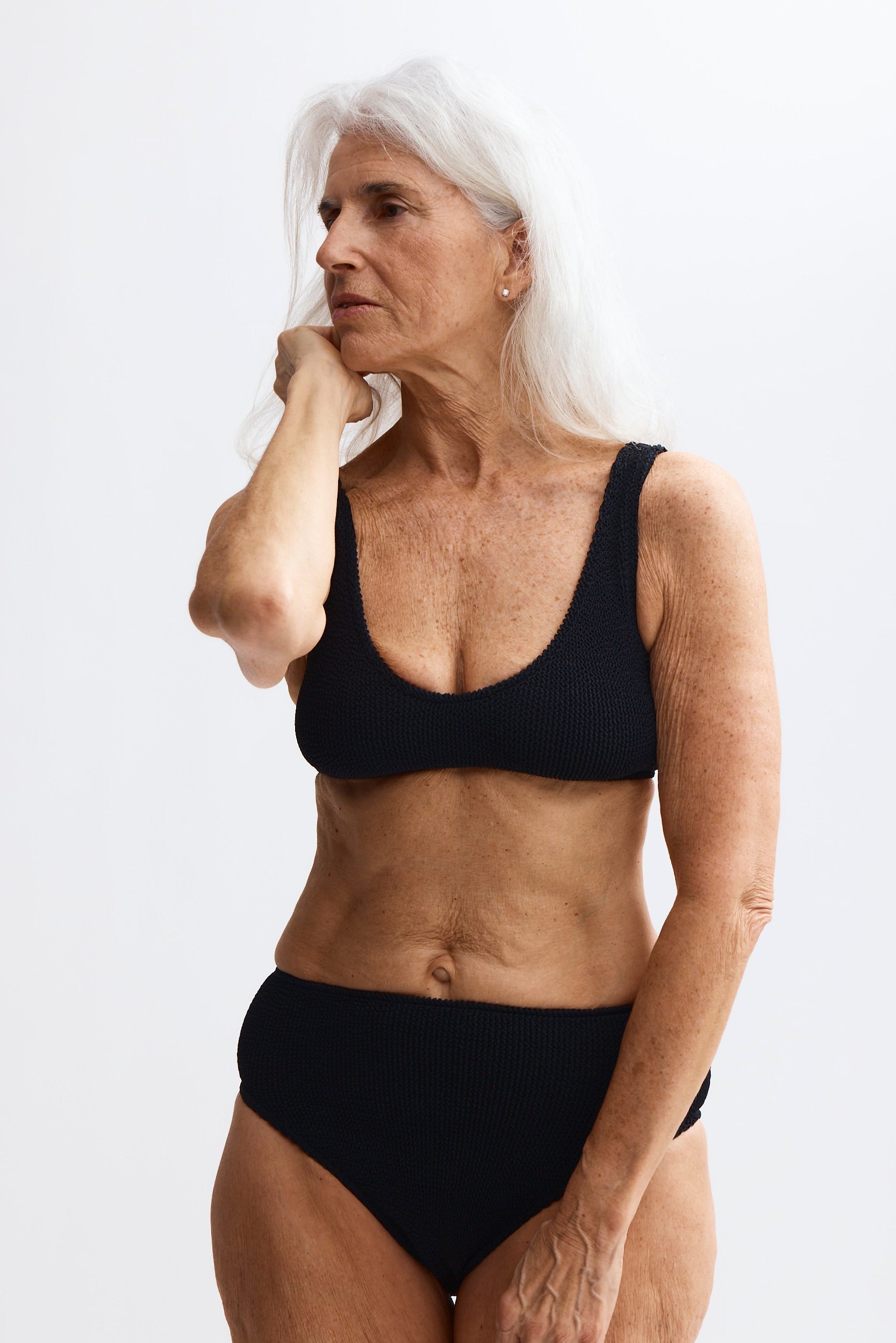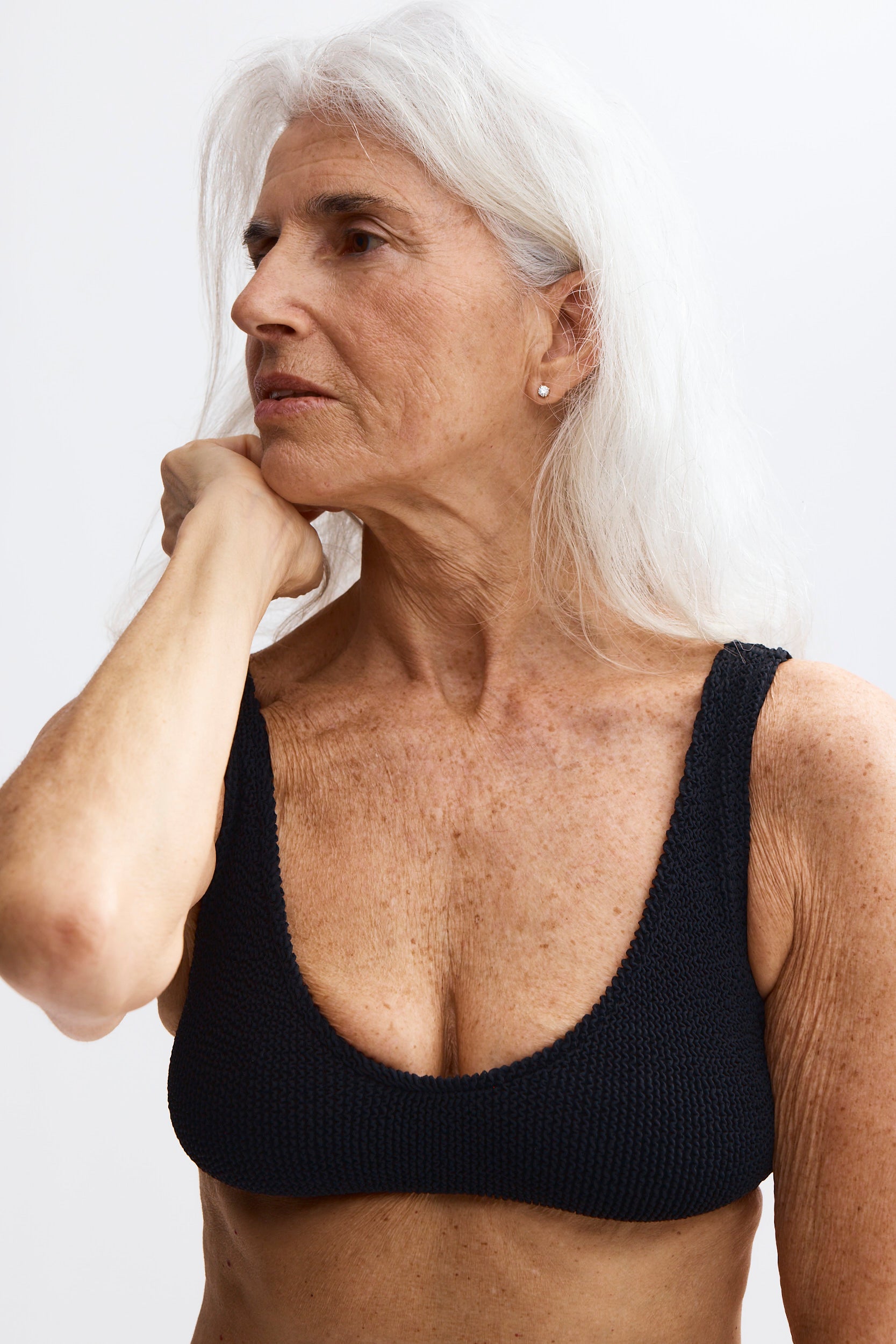 The Eva bikini top has an elegant v-shaped neckline and flattering lower scoop back, offering less coverage than our classic square-neck Aplomb.