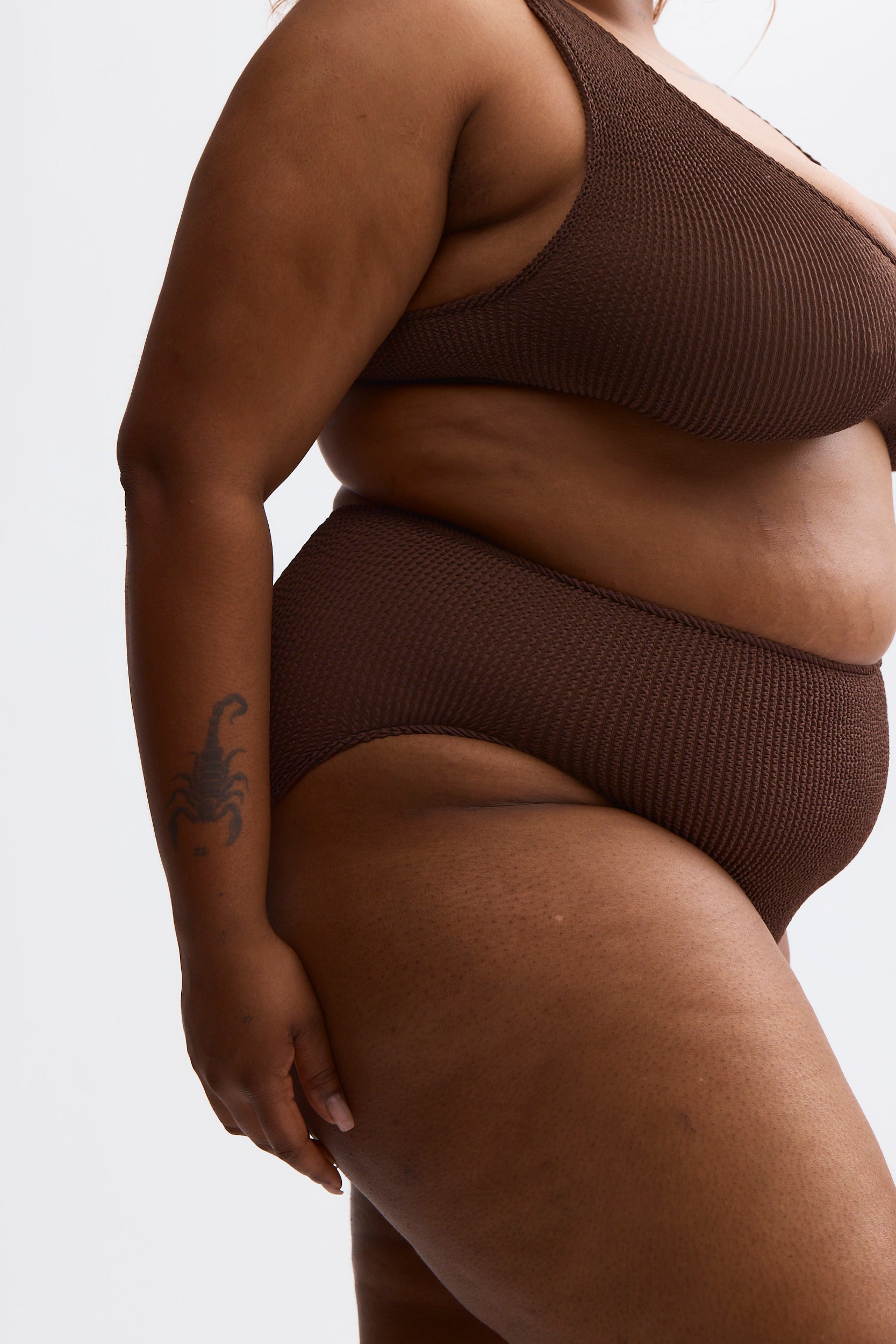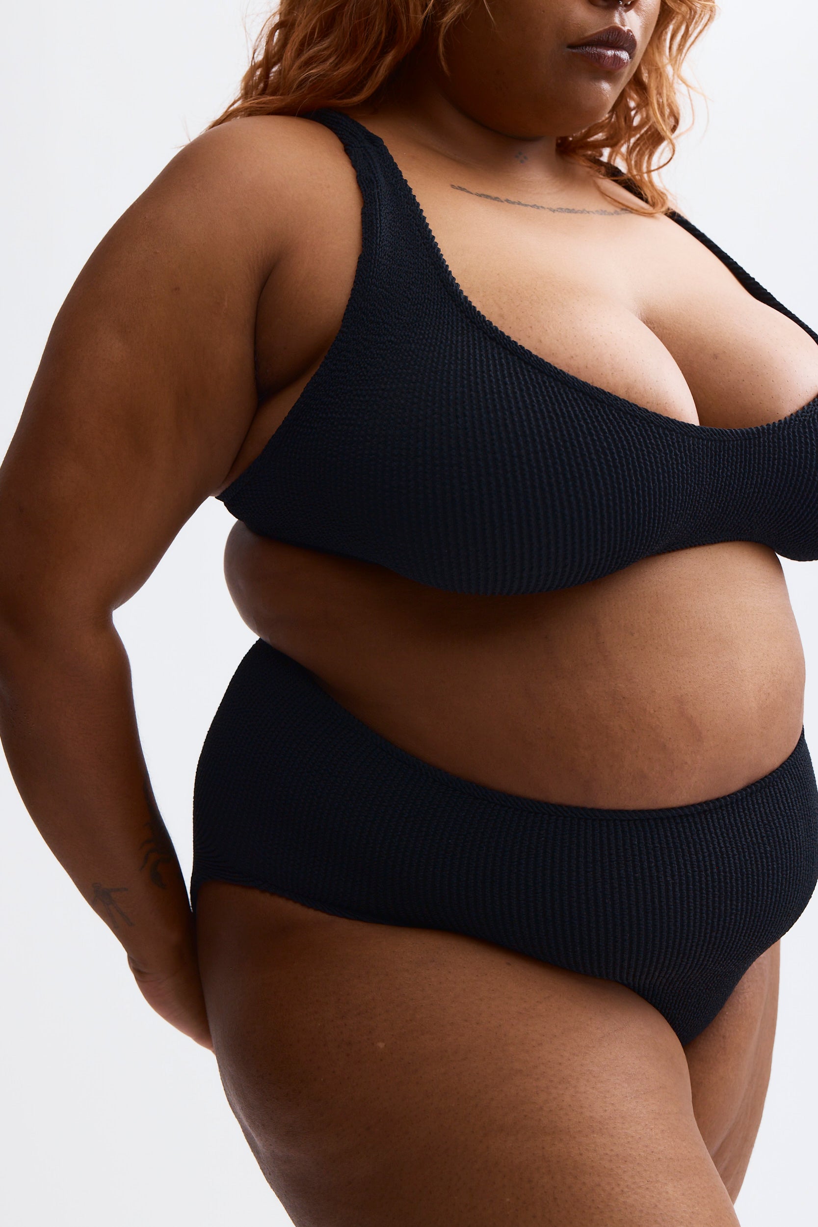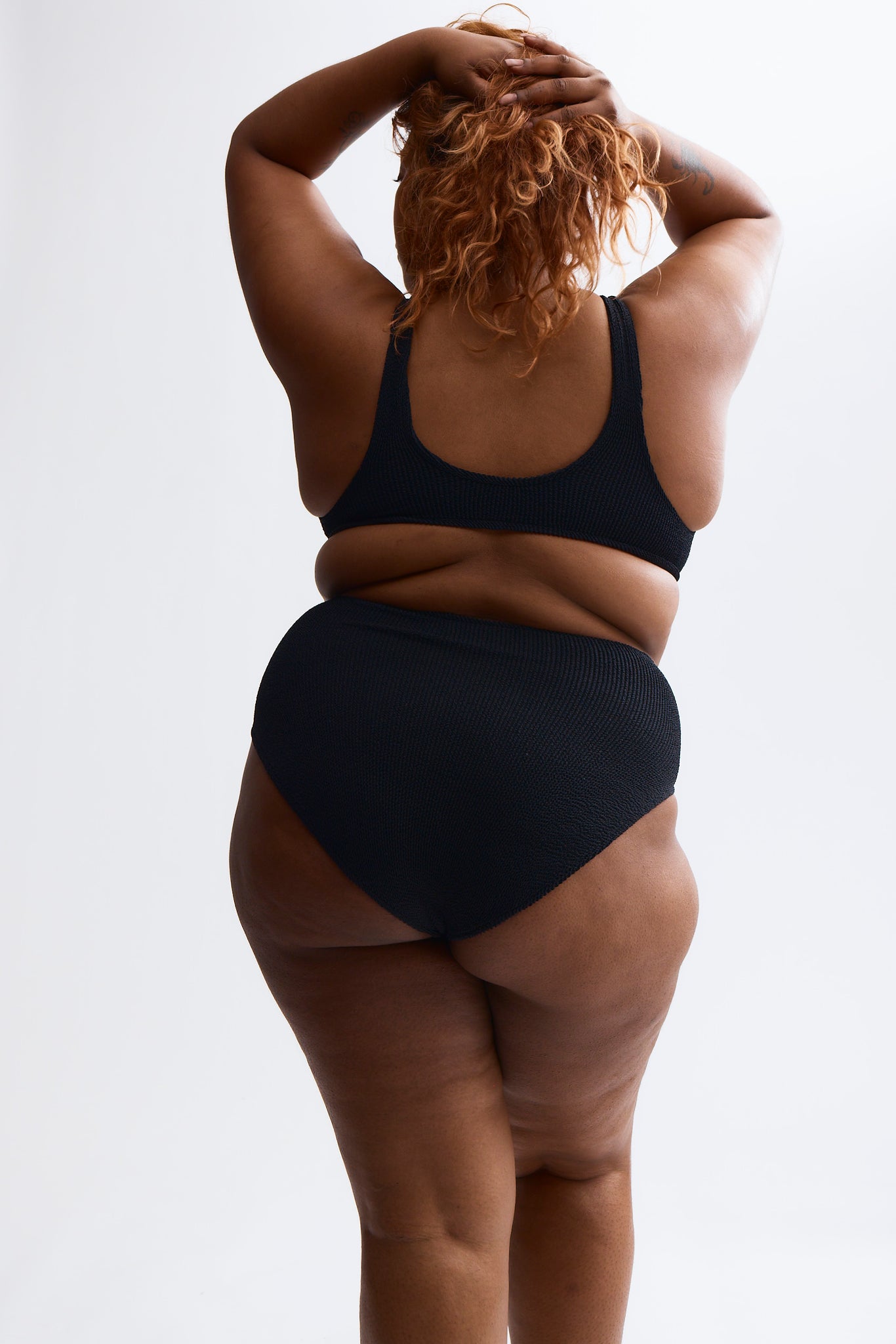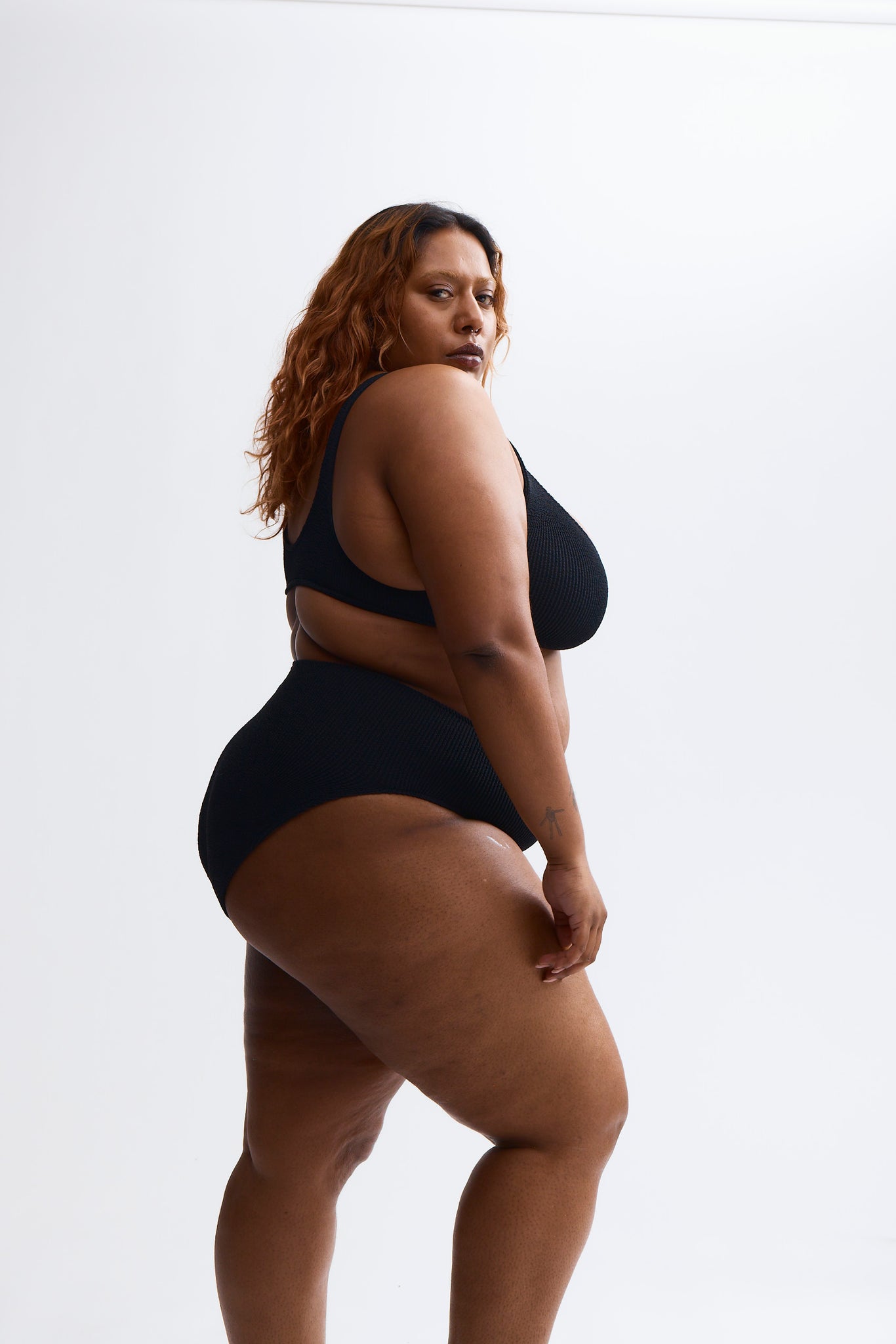 High Waist bikini bottoms offer a little more hip and belly coverage than Standard and can be worn above or below the belly button.